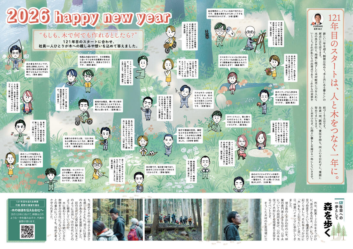 新年のご挨拶 あけましておめでとうございます。旧年中は格別のご厚情を賜り、誠にありがとうございました。本年も社員一同さらに誠心誠意、業務に努めてまいりますので、一層のお引き立てを賜りますようお願い申し上げます。 皆様のご多幸と貴社益々のご発展を祈念いたします。 木と共に歩んできた私たちが、新しい年のはじまりに、あらためて木を見つめ直しました。 創業120周年を経て、「材木商から始まった」という原点を改めて共有した昨年。そして121年目のいま、私たちはその原点を未来へ広げていく一年を迎えました。今号では、そんな思いを込めて、社員一人ひとりが “ もし木で何でも作れるとしたら?”をテーマに、木への親しみや想い、そして未来への発想を言葉にしました。 今号は、新春特別号です。下記画像をクリックしていただくと、別タブで紙面がご覧いただけます。また、ページ下部より、PDFもダウンロード可能です。