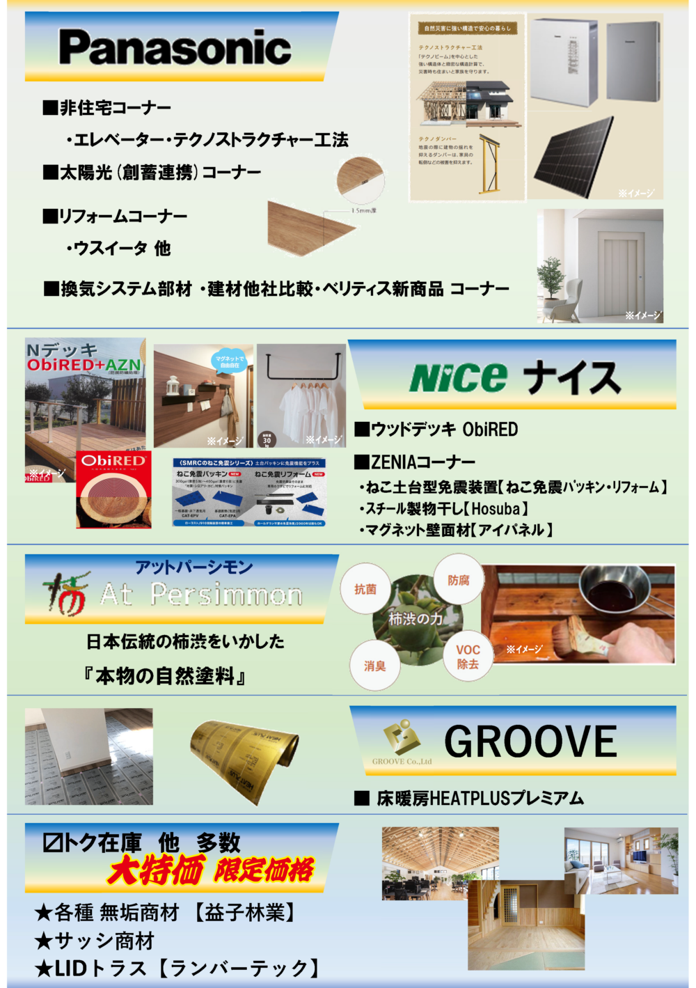 展示内容:非住宅、太陽光(創畜連携)、リフォーム、ウッドデッキ、自然塗料、床暖房、フェア限定価格の桝徳在庫商品(無垢商材、サッシ商材、LIDトラスなど)